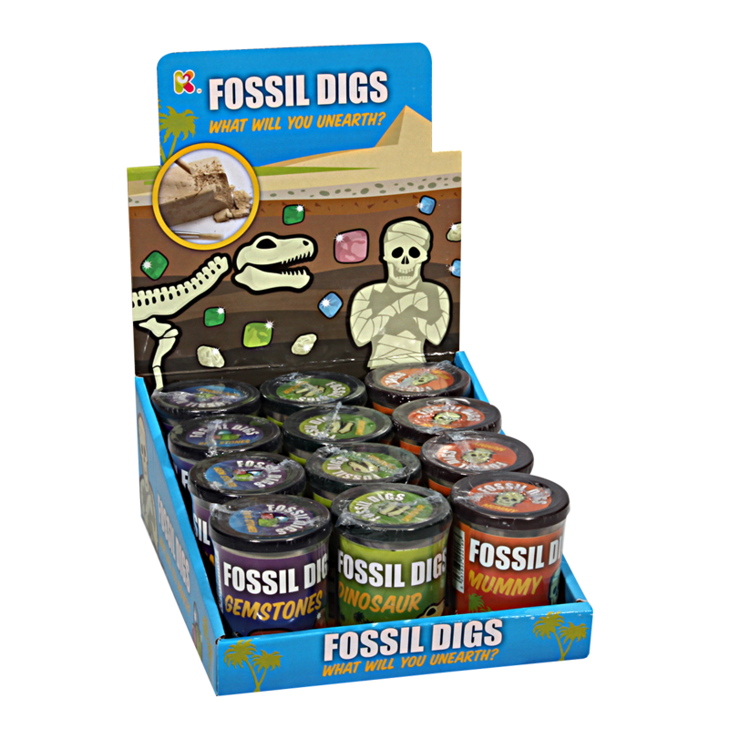 Minsta antal att beställa: 12 st (i display, 4 av varje: skelett, dinosaurie, ädelstenar).