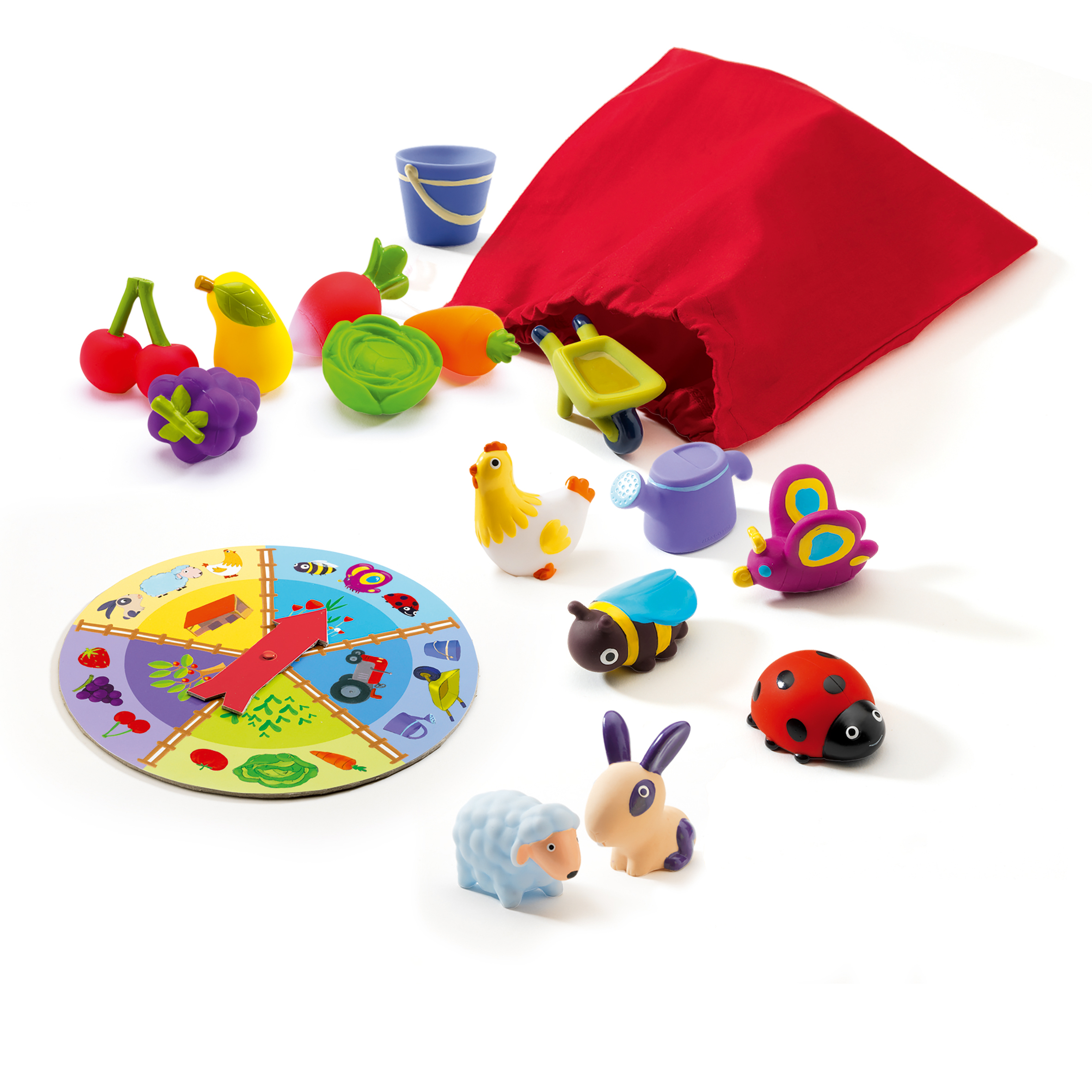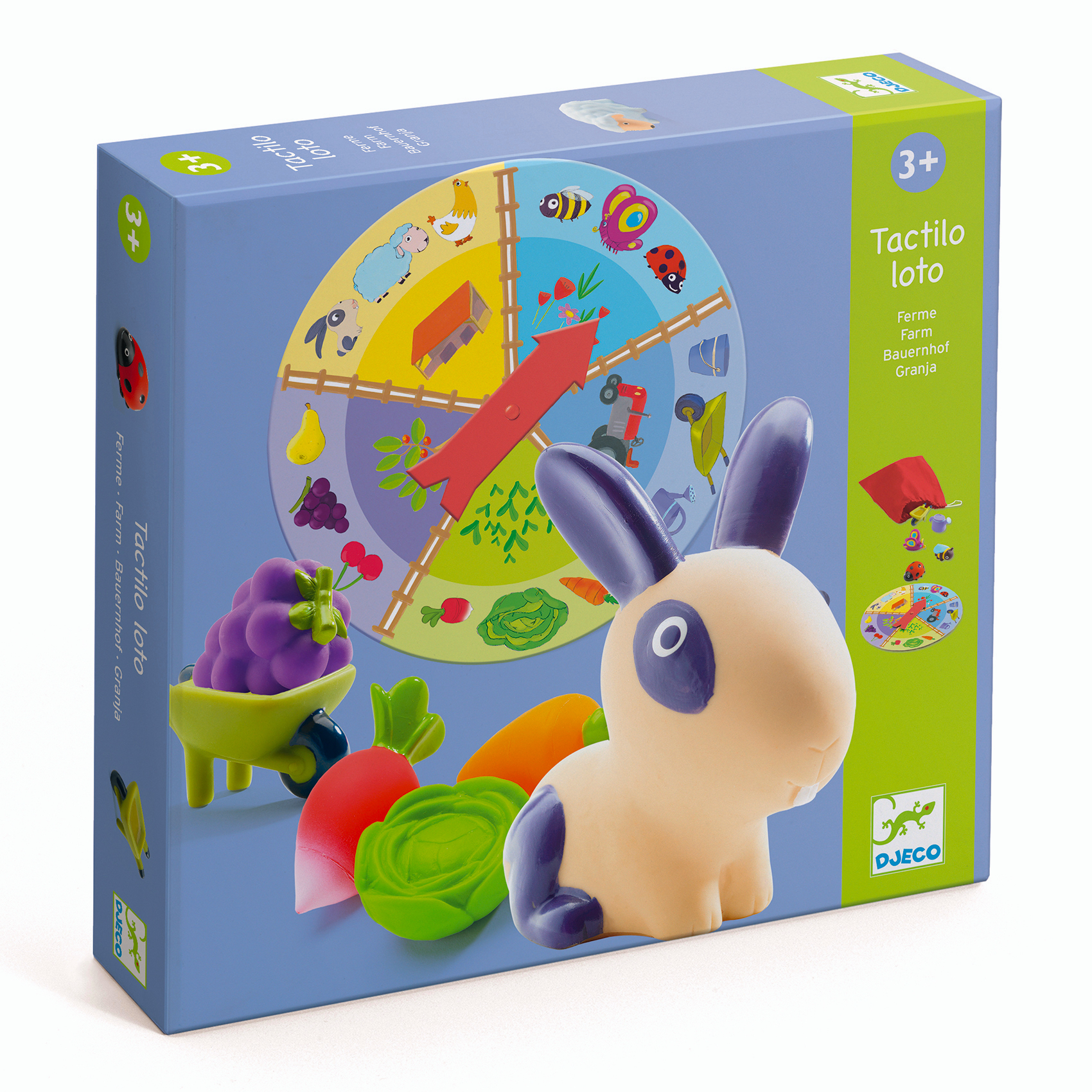 Ett roligt lotto spel med fina taktila figurer i plast och ett lottohjul. Spelet har bondgårdstema och innehåller de tre kategorierna: djur, insekter, verktyg/hjälpmedel, grönsaker och frukt.