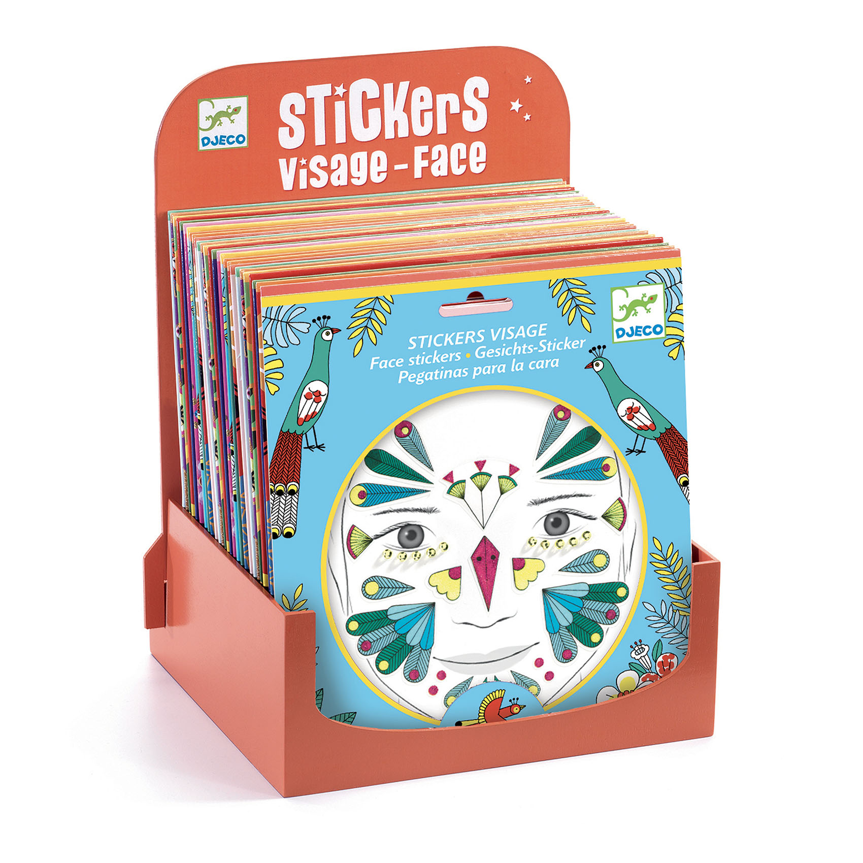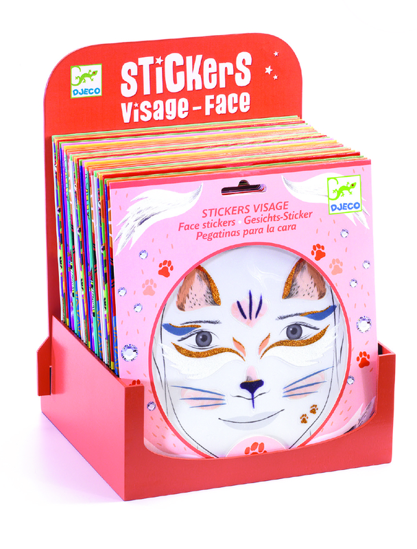 Praktisk display i trä till Djecos ansikts-klistermärken.