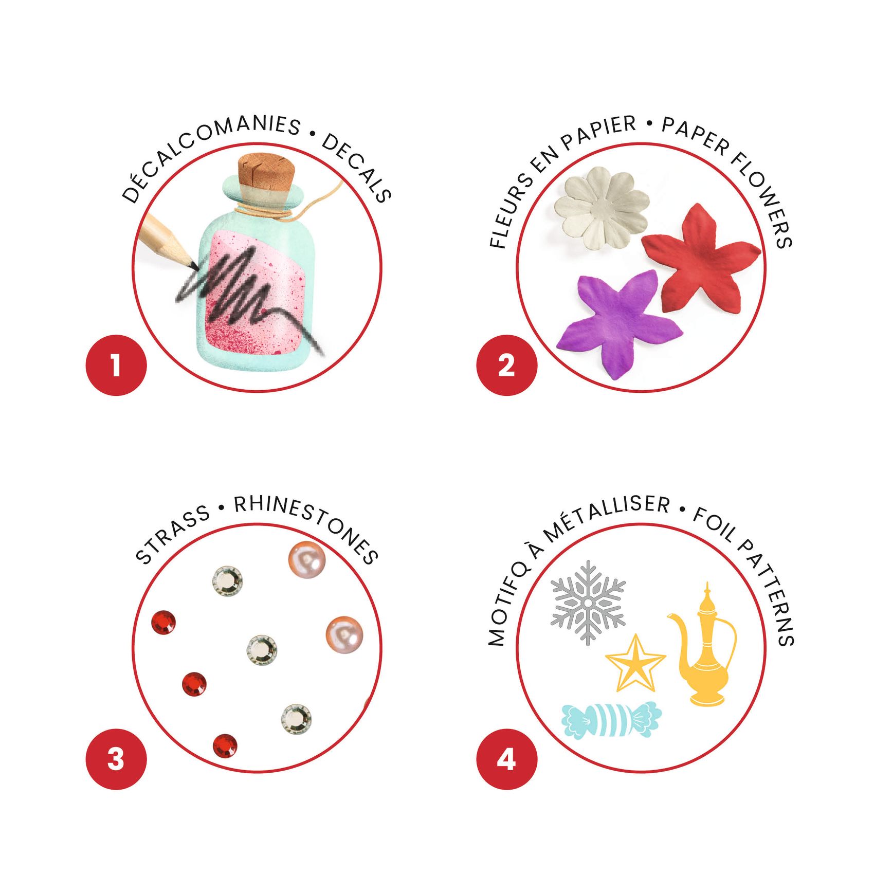 Från +6 till ca 10 år. Ett pysselset som kombinerar fyra olika tekniker för att dekorera 4 bilder inspirerade av en av de mest berömda klassiska balletterna. Innehåll: 4 bilder att dekorera, 4 ark med gnuggbilder, 30 pappersblommor, 1 ark med dubbelhäftande fästkuddar, 100 självhäftande dekorstenar, 4 ark med dubbelhäftande klistermärken för metallfolien, 5 ark metallfolie i olika färger, 1 häfte med steg-för-steg instruktioner i bilder.