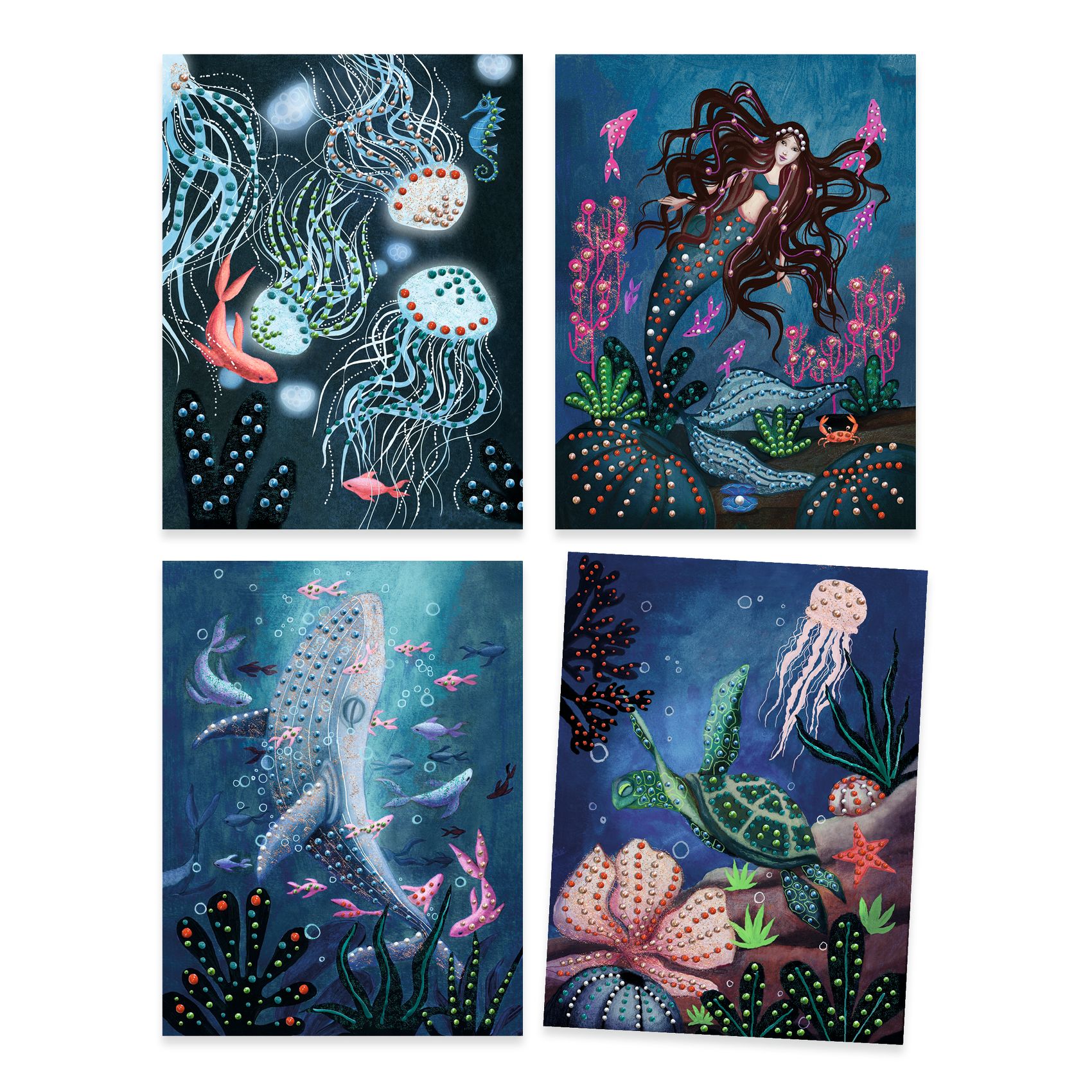 Från +7 till ca 12 år. Var kreativ och skapa underverk inspirerade av havets djup med detta fantastiska pyssel kit som erbjuder fyra underbara bilder att dekorera med hjälp av en fascinerande 3D-färg som glittrar och skimrar i olika nyanser. Den speciella färgen gör att du kan skapa upphöjda prickar och linjer för att komplettera de fyra vackra bilderna av djur och annat från djuphavet på ett fantastiskt sätt. Färgen kommer i ett urval av glittrande, pärlemorskimrande och matta nyanser i små och smidiga miniatyrflaskor med smala, spetsiga pipar för enkel applicering. Tillsammans med den medföljande penseln, som låter dig sprida ut färgen över större områden, kan du experimentera med olika tekniker och skapa en mängd olika effekter för att verkligen få bilderna att stråla. Det illustrerade instruktionshäftet guidar dig genom aktiviteten steg-för-steg med hjälp av färgbilder och visar hur konstnären som designade bilderna tycker att du ska göra för att få ett fantastiskt resultat. När du vill sluta för dagen kan du hålla ordning på kittets alla delar genom att förvara dem i den praktiska förvaringsasken som hålls stängd med ett elastiskt band. Innehåll: 4 olika illustrerade kort (28 x 21 cm) att färdigställa, 8 specialfärger i små flaskor med applikator (i olika glittrande, pärlemorskimrande och matta nyanser), 1 pensel, 1 häfte med steg-för-steg instruktioner i färgbilder, 1 förvaringsask med elastisk stängning.
