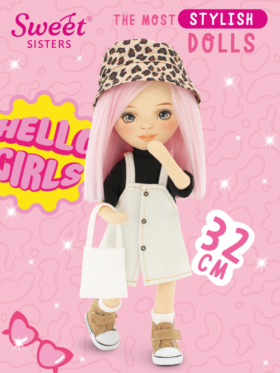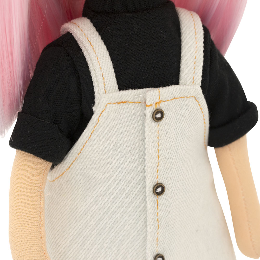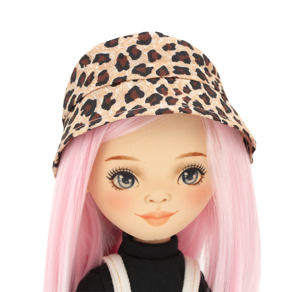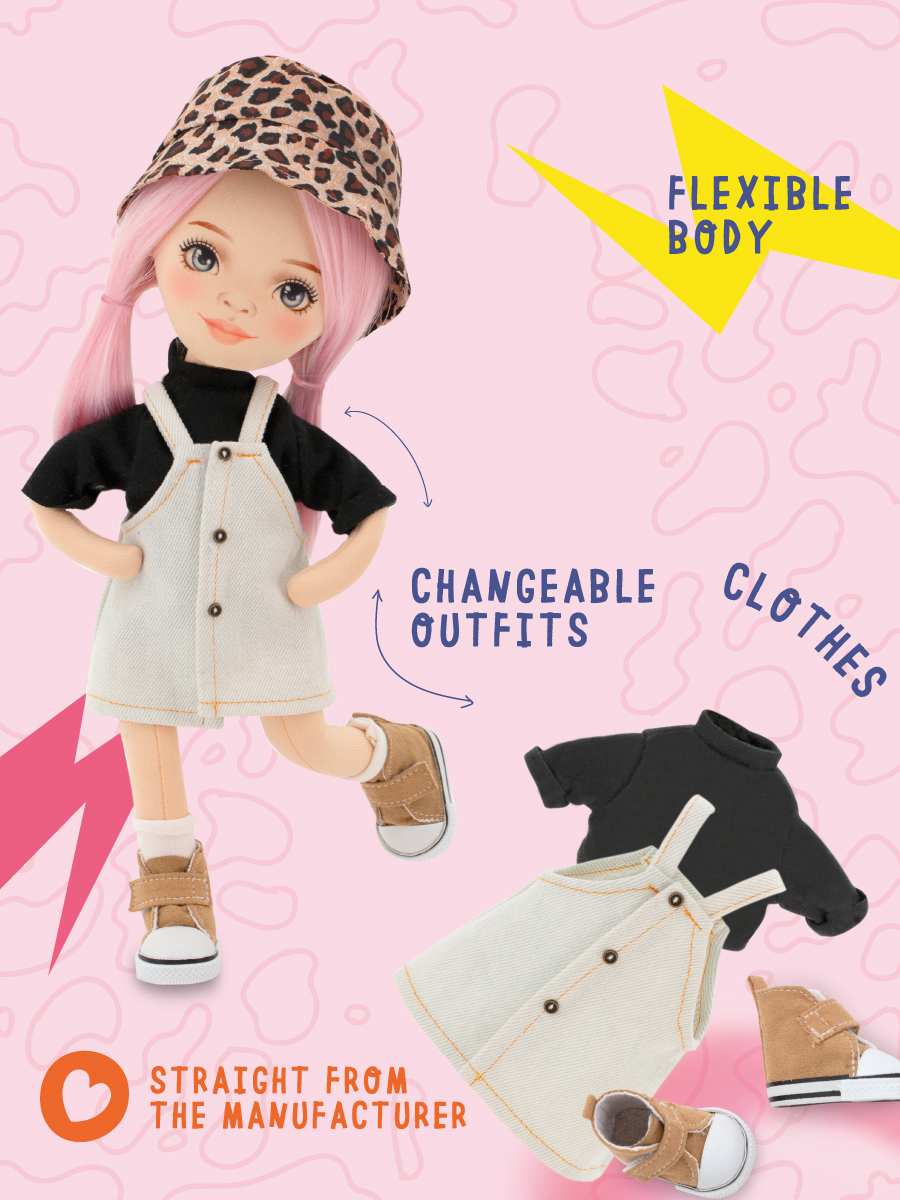 En elegant handgjord docka med axellångt rosa hår och vackra gråblå ögon som lyser upp ett ansikte fullt av karaktär. Det glänsande håret är av premium kvalitet och kan formas om med hjälp av till exempel locktång, så det är bara att leka stylist och experimentera med olika frisyrer och stilar! Dockan är dessutom utrustad med en flexibel stomme som gör att den kan stå på egna ben och att du kan få den att posera nästan hur som helst. Hon är klädd i en snygg vit hängselklänning i denim med knappslå på framsidan, kombinerad med en kortärmad svart tröja, en lekfull leopardmönstrad solhatt samt vita strumpor, och på fötterna bär hon ett par bekväma bruna skor med kardborrband. Både kläder och skor är avtagbara och passar alla dockor i serien. Dockans ansikte är konstnärligt skapat och utfört med digitala tryck på tyget för att säkerställa lång hållbarhet samt ge karaktären uttrycksfulla och förtjusande ansiktsdrag. Både dockan och kläderna är tillverkade av högkvalitativa tyger i 100% polyester och dockan är stoppad med polyester fiber samt polyetenpellets. Både dockan och kläderna kan handtvättas och hängtorkas för att hålla dem fräscha.