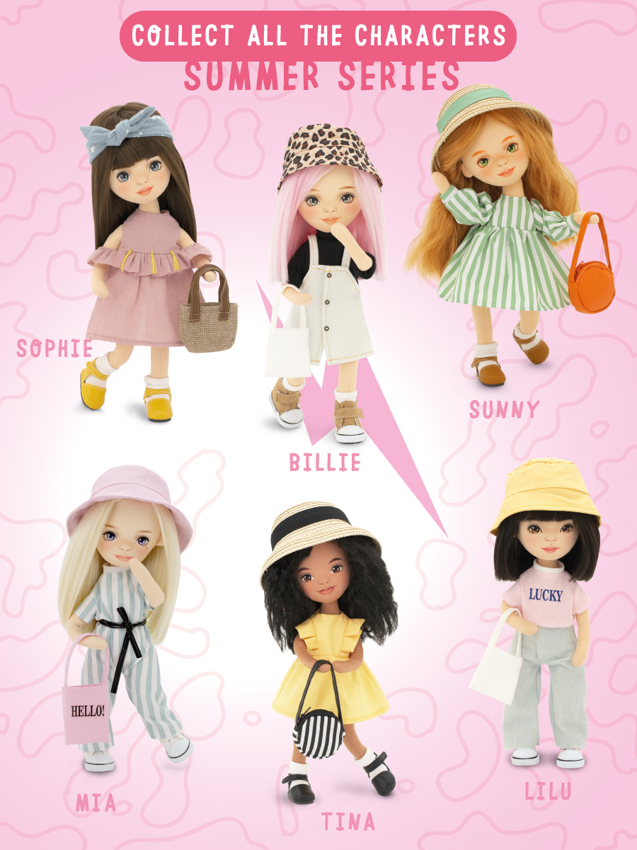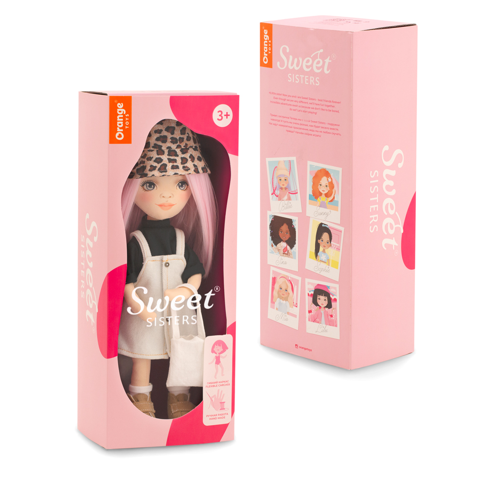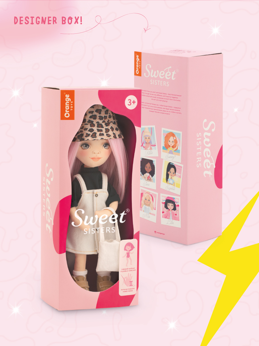 En elegant handgjord docka med axellångt rosa hår och vackra gråblå ögon som lyser upp ett ansikte fullt av karaktär. Det glänsande håret är av premium kvalitet och kan formas om med hjälp av till exempel locktång, så det är bara att leka stylist och experimentera med olika frisyrer och stilar! Dockan är dessutom utrustad med en flexibel stomme som gör att den kan stå på egna ben och att du kan få den att posera nästan hur som helst. Hon är klädd i en snygg vit hängselklänning i denim med knappslå på framsidan, kombinerad med en kortärmad svart tröja, en lekfull leopardmönstrad solhatt samt vita strumpor, och på fötterna bär hon ett par bekväma bruna skor med kardborrband. Både kläder och skor är avtagbara och passar alla dockor i serien. Dockans ansikte är konstnärligt skapat och utfört med digitala tryck på tyget för att säkerställa lång hållbarhet samt ge karaktären uttrycksfulla och förtjusande ansiktsdrag. Både dockan och kläderna är tillverkade av högkvalitativa tyger i 100% polyester och dockan är stoppad med polyester fiber samt polyetenpellets. Både dockan och kläderna kan handtvättas och hängtorkas för att hålla dem fräscha.
