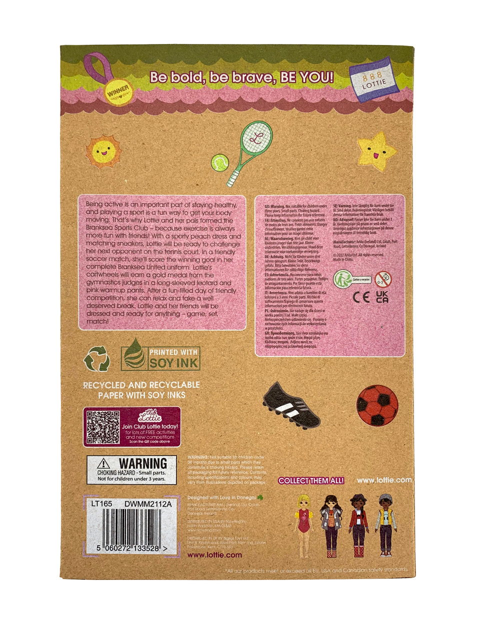 Att vara aktiv är en viktig del i att vara hälsosam, och att spela en sport är ett kul sätt att sätta kroppen i rörelse - och motion är alltid roligare tillsammans med vänner. Därför stöttar Lottie och hennes vänner den populära idrottsklubben i deras hemstad Branksea, där man bland annat kan spela tennis, fotboll eller träna olika gymnastiska grenar. I detta set får du tre stycken kompletta utstyrslar med kläder och utrustning för fotboll, tennis och gymnastik vilket passar perfekt för de aktiva dockorna som gillar att röra på sig och pröva på lite olika sporter tillsammans. Ett blå-vitt fotbolls ställ med tröja, shorts, strumpor, svarta fotbollsskor och en fotboll; ett aprikos-rosa tennis ställ med kjol, riktigt kortärmad tröja, pannband, handledsband, strumpor, tennisskor, tennisracket och tennisboll, samt ett snyggt gymnastik set med en gymnastikdräkt i lila, vitt och ljusgrönt, rosa mjukisbyxor så att Lottie inte blir kall medan hon väntar på sin tur och en stor guldmedalj att vinna och hänga runt halsen på dockan. Kläderna passar till alla dockor i Lottie-serien och kan handtvättas eller tvättas i en tvättpåse på skontvätt programmet. Dockor ingår ej.