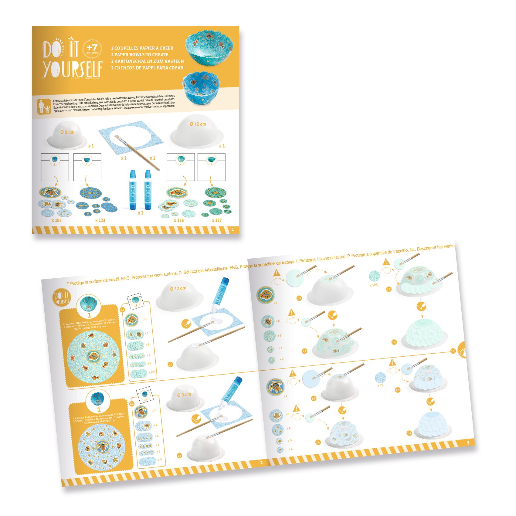 Ett komplett pyssel kit som innehåller instruktioner och allt material som behövs för att skapa två underbara skålar endast bestående av tunna papperscirklar och lim.