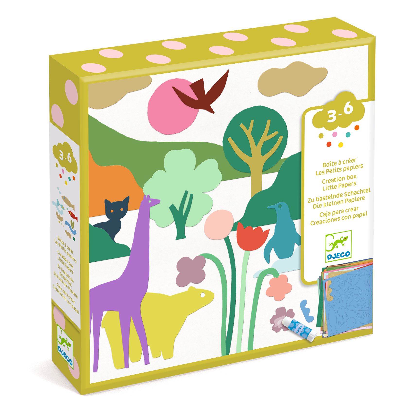 Innehåll: 21 ark i olika färger med utstansade figurer att trycka ut, 10 tomma och dubbelvikta ark (21 x 42 cm) att skapa bilderna på, 1 limstift, 1 häfte med inspiration, 1 förvaringsask.