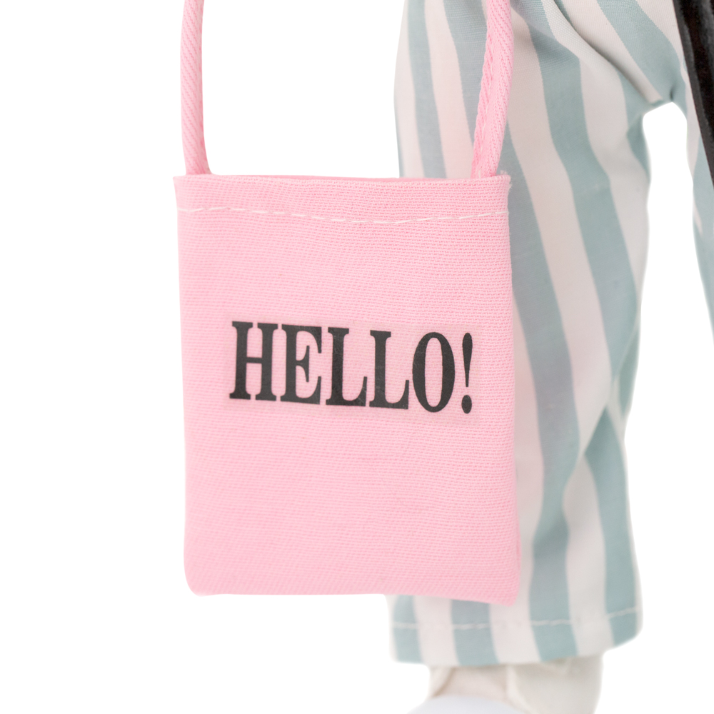 En elegant handgjord docka som har långt blont hår och vackra blågrå ögon som lyser upp ett ansikte fullt av karaktär. Det glänsande håret är av premium kvalitet som kan formas om med hjälp av till exempel locktång, så det är bara att leka stylist och experimentera med olika frisyrer och stilar! Dockan har dessutom en flexibel stomme i kroppen som gör att den kan stå upp och att du kan få den att posera nästan hur som helst. Hon är klädd i en fräsch långrandig jumpsuit med korta ärmar och ett svart knytbälte, samt vita skor, en rosa solhatt och en matchande tygkasse. Både kläderna och skorna går att ta av och passar alla dockor i serien. Dockans ansikte är konstnärligt skapat och utfört med digitala tryck på tyget för att säkerställa lång hållbarhet samt ge karaktären uttrycksfulla och förtjusande ansiktsdrag. Både dockan och kläderna är tillverkade av högkvalitativa tyger i 100% polyester och dockan är stoppad med polyester fiber samt polyetenpellets. Både dockan och kläderna kan handtvättas och hängtorkas för att hålla dem fräscha.