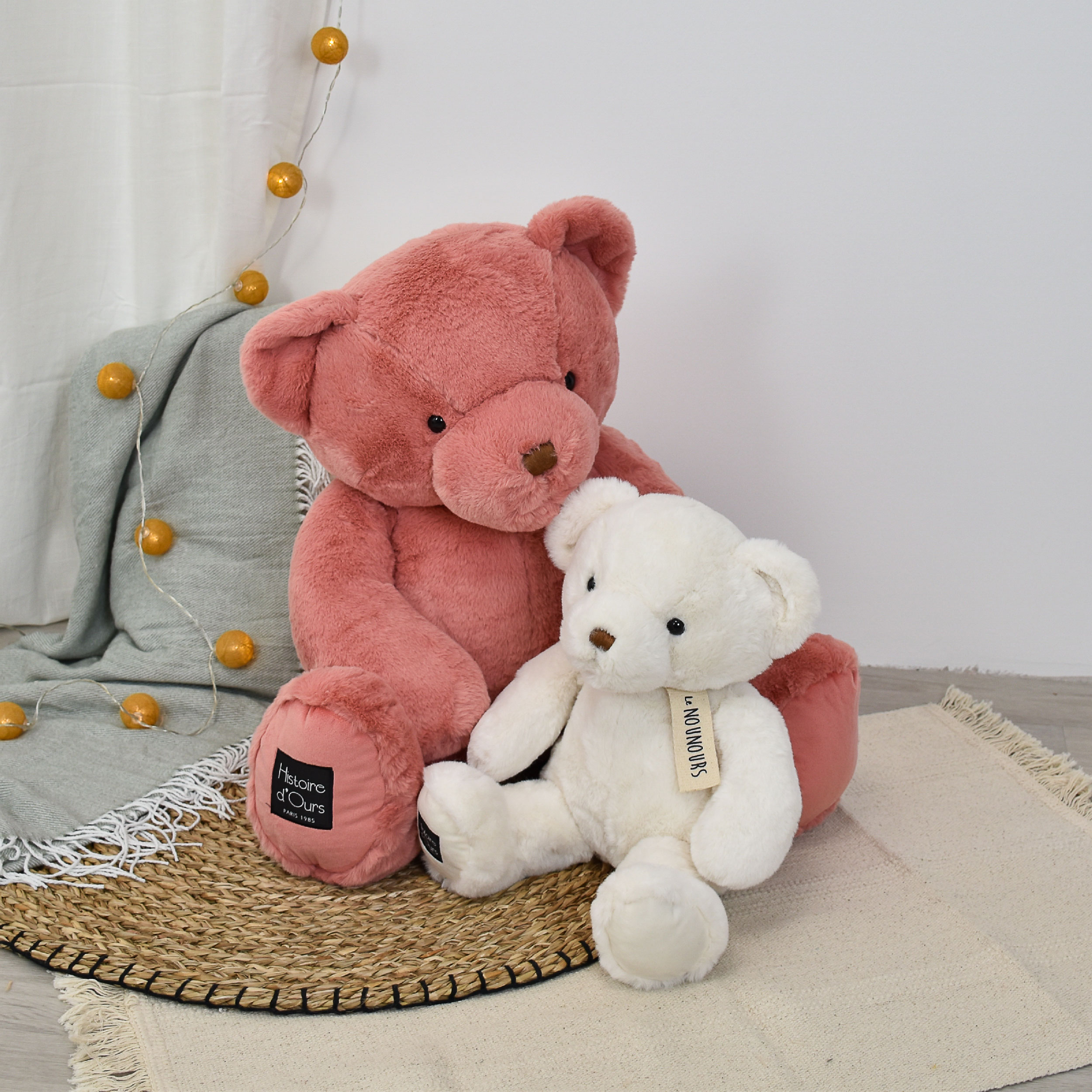En stor vävd etikett avslöjar dess namn: Le Nounours. Den högra tassen har en vävd etikett med texten Histoire d'Ours. Denna björn är onekligen DEN tidlösa presenten för alla åldrar!