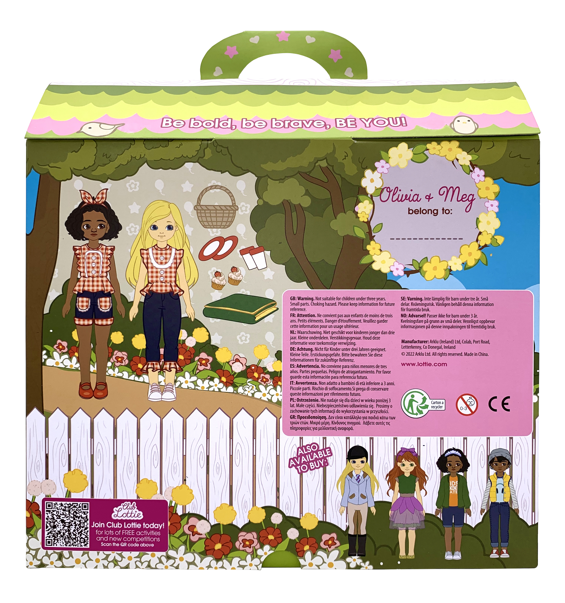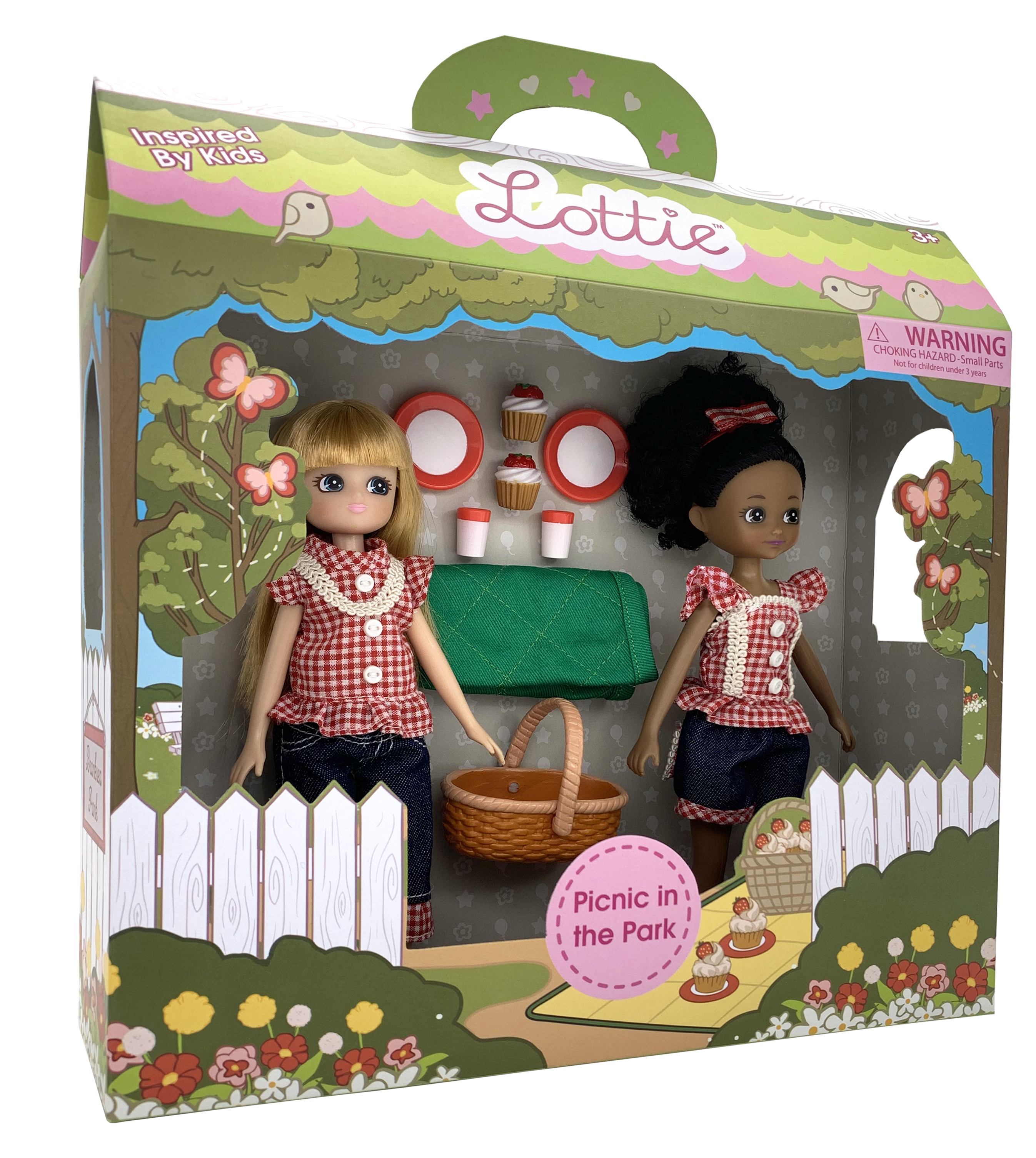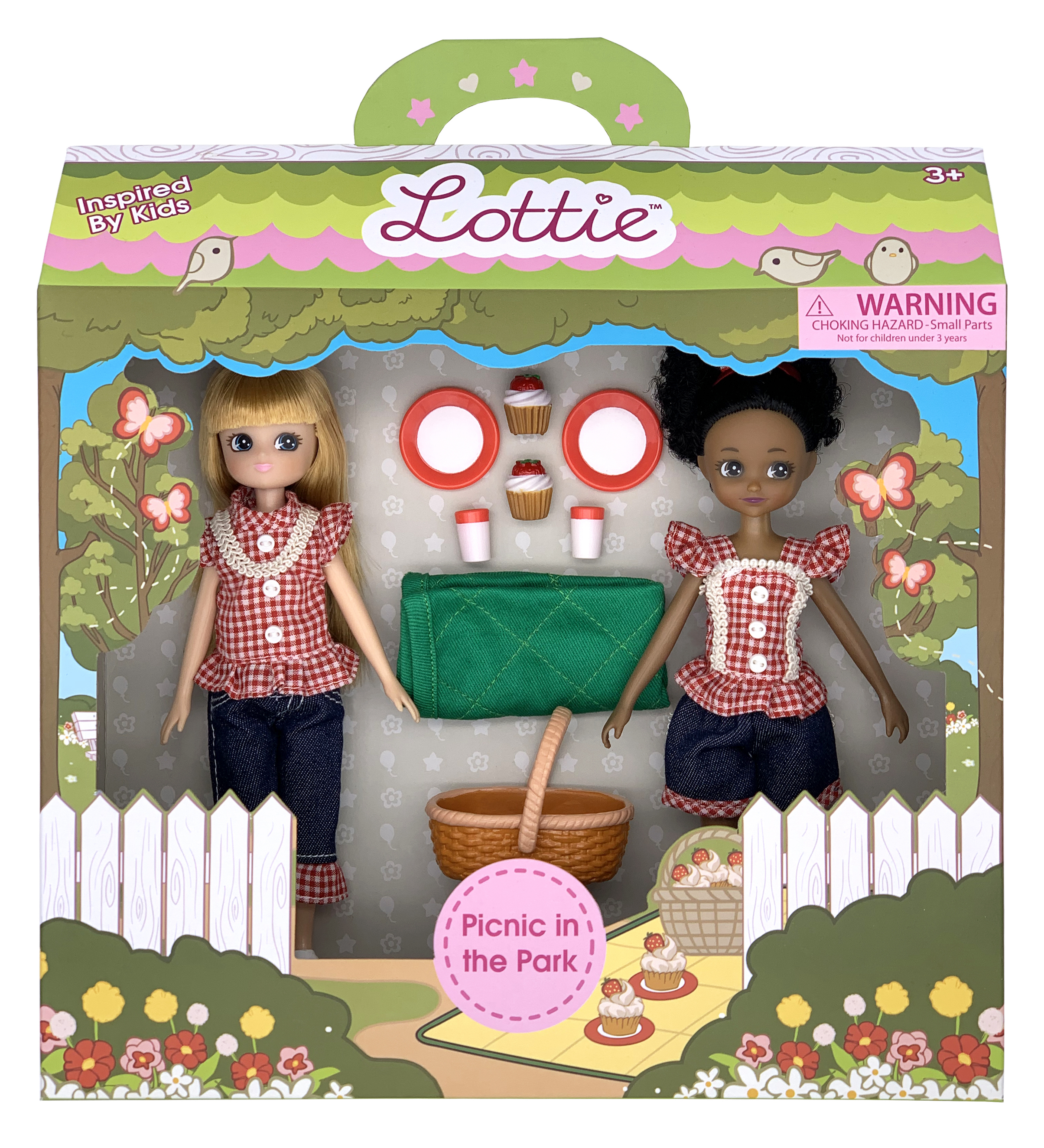 Ett kul set med de två Lottie dockorna Olivia och Meg och allt de behöver för en härlig picknick i parken. Den mörkhyade dockan har bruna ögon samt ett lite krulligt svart hår uppsatt med en rosett och är klädd i en snygg röd rutig topp med axelband och volanger, mörka jeansshorts med röd rutiga detaljer samt glänsande röda skor. Den ljushyade dockan har blå ögon, långt blont hår och är klädd i en röd rutig topp i en lite annorlunda modell än den första dockan, mörka, korta jeans med röd rutig volang nertill samt vita skor med en röd rand runt. De har tagit med sig en picknick korg med en grön filt att sitta på, två tallrikar, två glas samt två riktigt mumsiga bakelser med jordgubbar att njuta av. Dockorna är 18 cm höga, kan stå av sig själva och utformades utifrån proportionerna på 9-åriga tjejer. Armar och ben kan vridas och riktas som man vill, och knäna går att böja försiktigt till tre olika positioner. Håret går att borsta och sätta upp i olika frisyrer och kläderna går att ta av och passar till alla andra dockor i Lottie-serien.