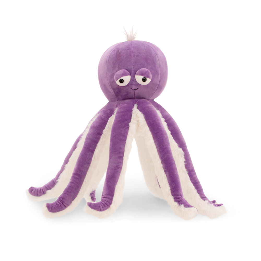 En snygg och cool bläckfisk i lila med fluffig vit undersida, utstående ögon med hängande ögonlock, ett glatt litet leende, små böjar i änden på alla åtta tentakler och en charmig liten tofs mitt på huvudet. Tillverkad i ett super-mjukt stretchtyg av 100% polyester och fylld med en speciell polyester fiber som ger maximal mjukhet, med hög kvalitet i både material och säkerhet. Kan handtvättas och hängtorkas vid behov för att hålla den fräsch.