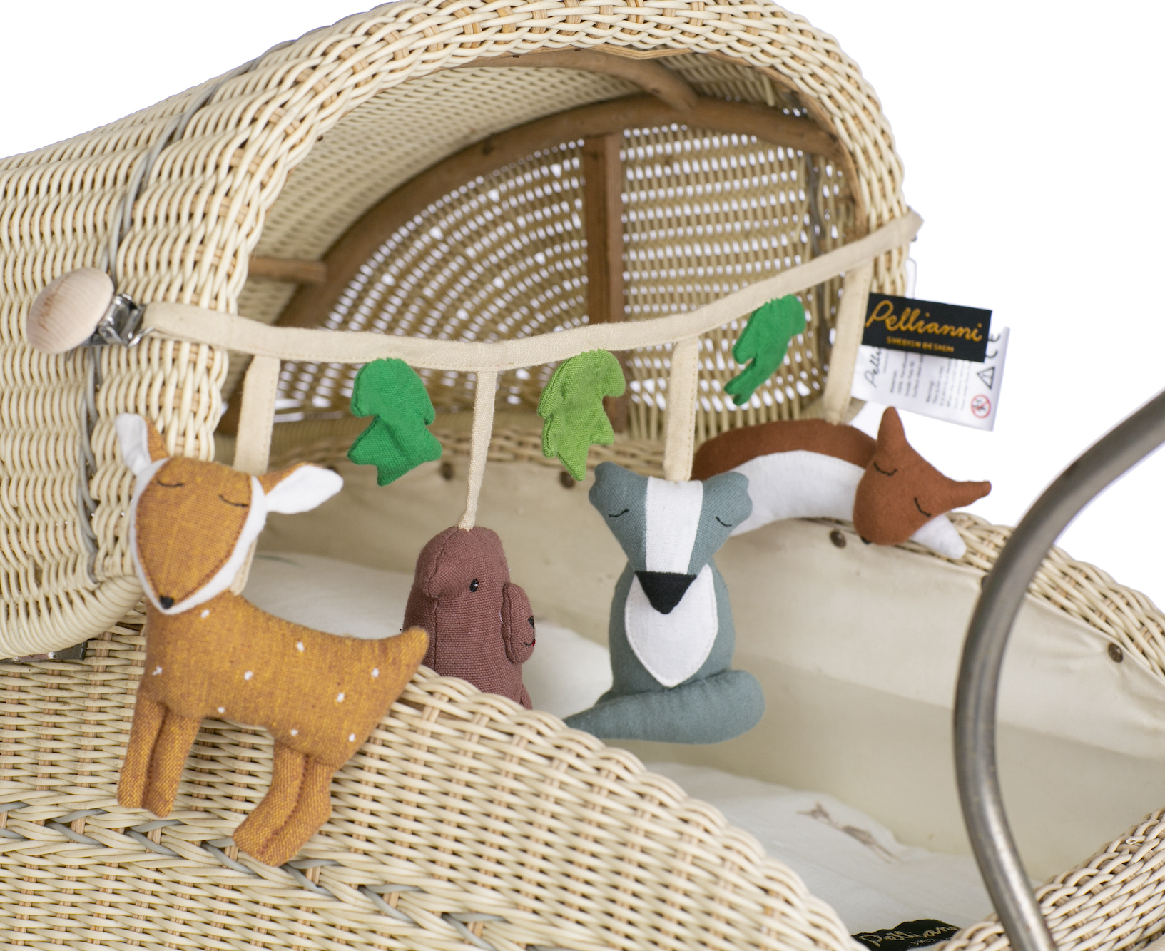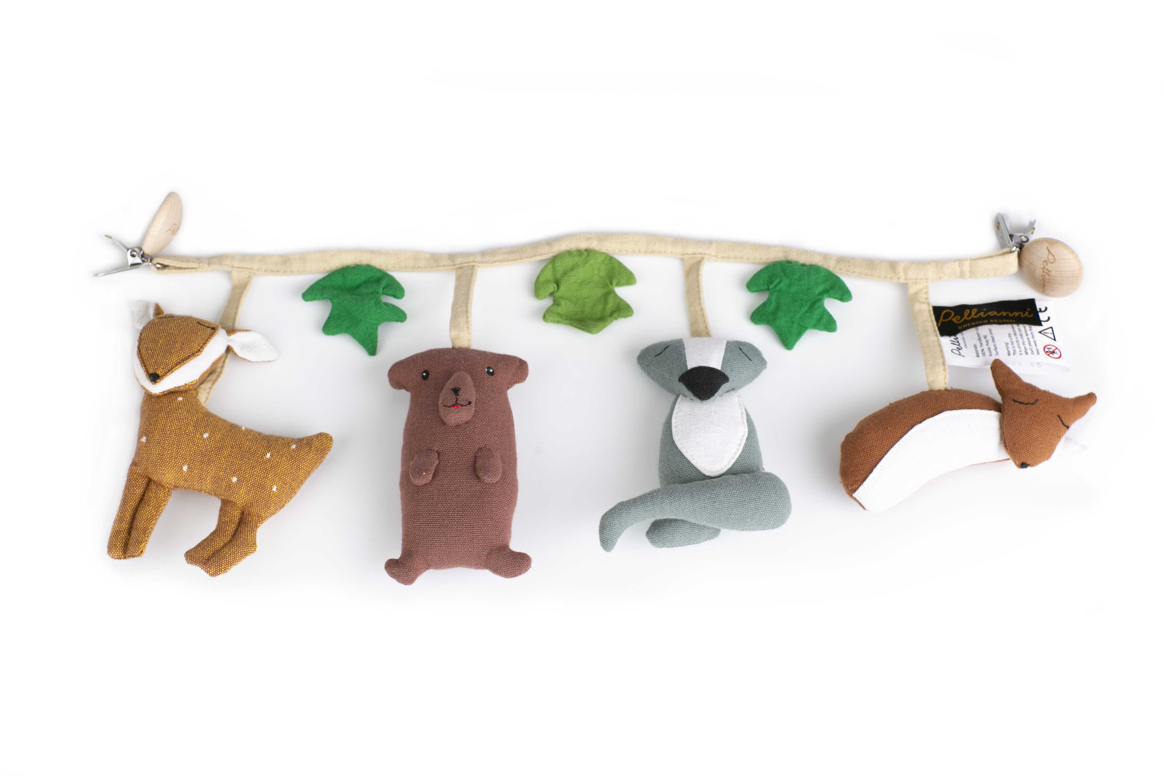Ett snyggt, Fair Trade-märkt och ekologiskt barnvagns-hänge med skogens djur som tema och två klämmor - en i varje sida - att sätta fast den med. Hänget har ett rådjur, en björn, en grävling och en räv samt tre löv som svajar med vagnens rörelser eller vinden och ger den lilla något kul att titta på eller undersöka under promenader med vagnen. När barnet har blivit äldre (3 år) kan de stoppade figurerna klippas loss från bomulls bandet och lekas med som små trasdockor. Tillverkad i en Fair Trade certifierad fabrik av ekologisk bomull samt klämmor av metall och trä samt kommer i en påse av organza. Alla material och färger är ekologiska samt ofarliga för både miljön och de som jobbar med dem. Inga djurförsök av något slag har använts i utvecklandet eller producerandet av denna produkt eller dess beståndsdelar. Kan tvättas vid behov.