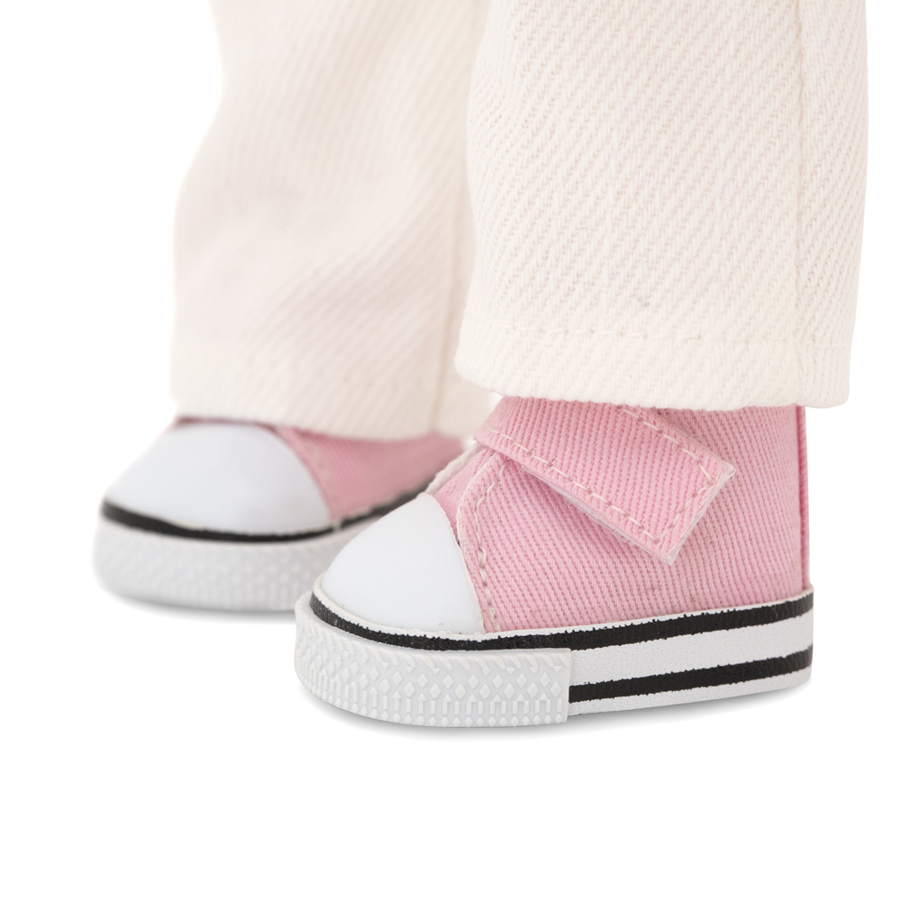 En elegant handgjord docka som har vågigt rödlätt hår och vackra gröna ögon som lyser upp ett ansikte fullt av karaktär. Det snygga håret är av premium kvalitet som kan formas om med hjälp av till exempel locktång, så det är bara att leka stylist och experimentera med olika frisyrer och stilar! Dockan har dessutom en flexibel stomme i kroppen som gör att den kan stå upp och att du kan få den att posera nästan hur som helst. Hon är klädd i en långärmad tröja med volanger som en snygg detalj, ljusa byxor och rosa skor, tillsammans med ett matchande hårspänne och en rosa tygkasse. Både kläderna och skorna går att ta av och passar alla dockor i serien. Dockans ansikte är konstnärligt skapat och utfört med digitala tryck på tyget för att säkerställa lång hållbarhet samt ge karaktären uttrycksfulla och förtjusande ansiktsdrag. Både dockan och kläderna är tillverkade av högkvalitativa tyger i 100% polyester och dockan är stoppad med polyester fiber samt polyetenpellets. Både dockan och kläderna kan handtvättas och hängtorkas för att hålla dem fräscha.