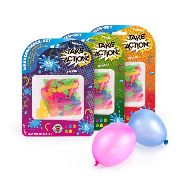 TAKE ACTION Water bombs set 100 pcs, 3 assorted Varumärke Du måste vara inloggad för att köpa Lägg till mina favoriter Ta bort från favoriter Från +3 år. Vattenkul utomhus! Med dessa 100 vattenbomber i 6 ljusa färger och inklusive kranadapter för 3/4 tums kranar, garanteras kul! Kommer i 3 olika förpackningsdesigner. Artikelnr: TH962140 Standardlager: Finns i lager Produktmått inklusive förpackning: 16,0 cm x 4,0 cm x 22,0 cm. Minsta antal att beställa: 12 st.Priset avser per styck.