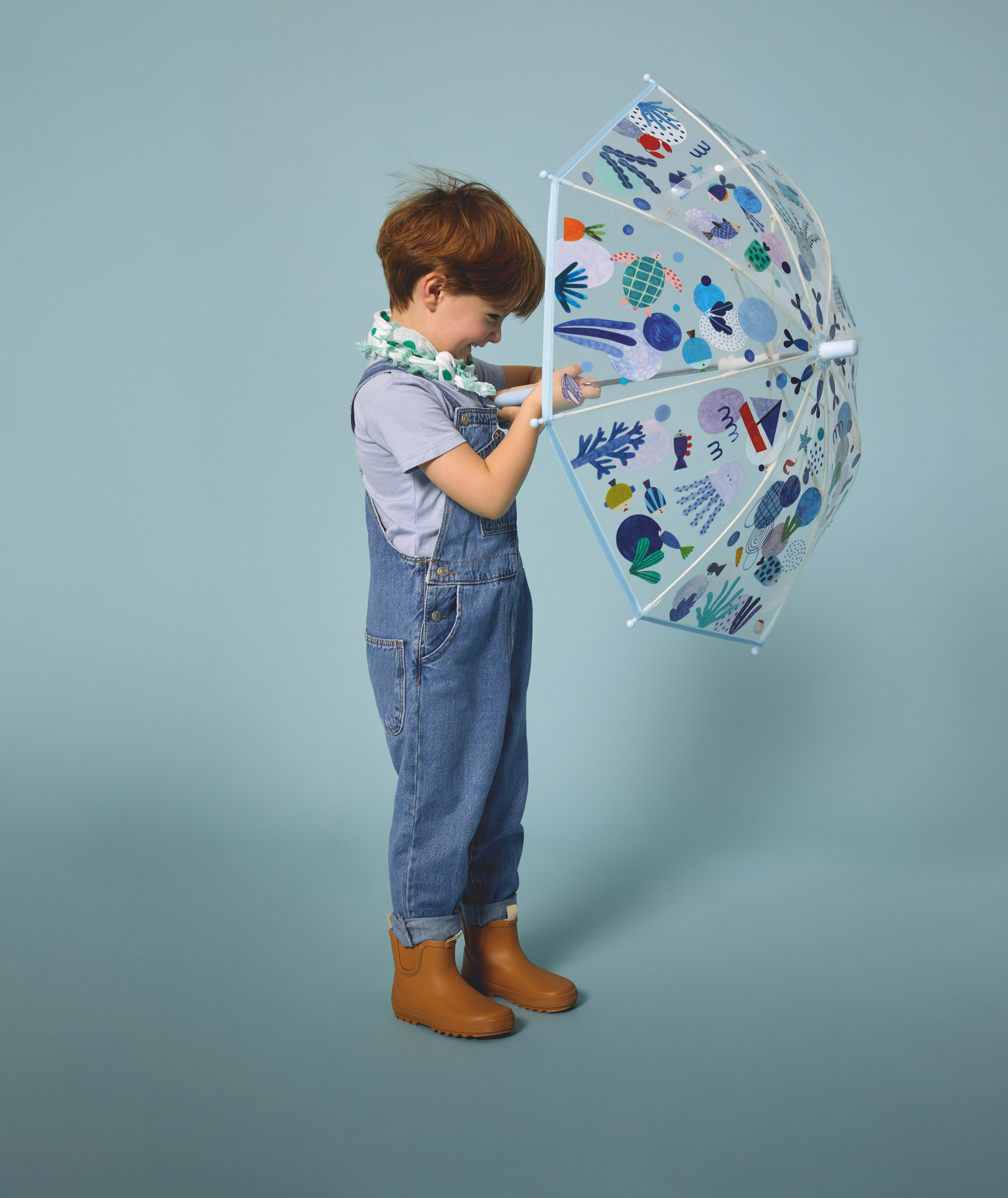Ett snyggt litet paraply för de mindre barnen, dekorerat med fina bilder av havens fiskar och djur, sjögräs, bubblor med mera på genomskinlig plast och kantat med ett snyggt ljusblått tygband.
